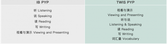 TWIS中文课程基于教材内容,在培养传统的听、说、读、写的基础上,融入了IB语言与文学课程的目标。比如在MYP语言与文学指南里,对于语言与文学学科所要培养的技能做出了清楚的说明,即听、说、读、写、视看和演示。