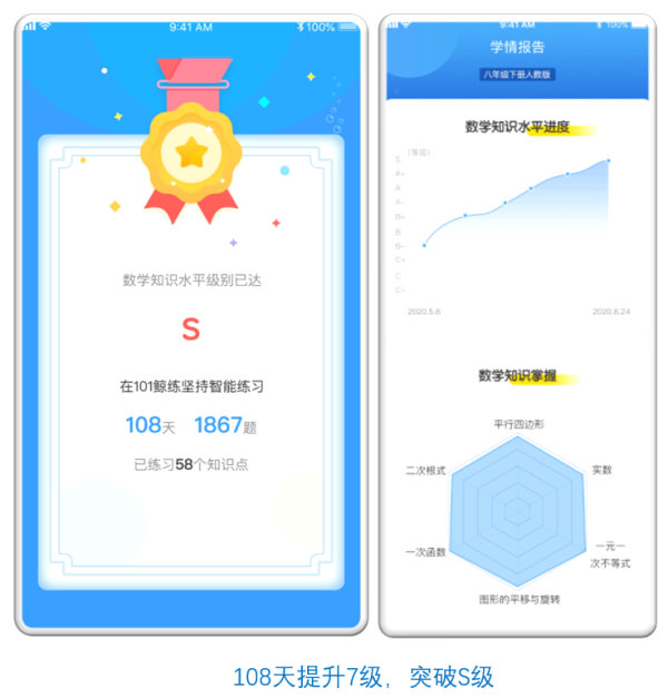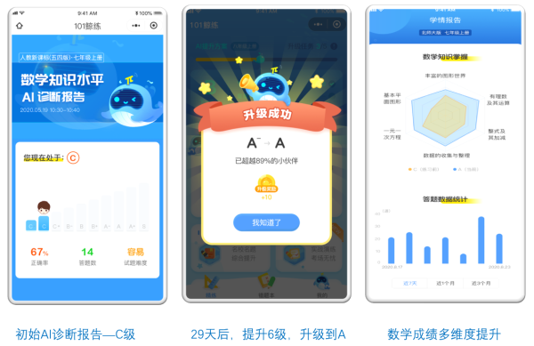 王研的数学成绩不算差,每次月考数学都能拿到98分左右(满分120),但是眼看要上初三了王研渴望数学有所突破。偶然了解到101鲸练AI题库,王研尝试着做了个测评,处于B-级,并推送了一套基于AI的个性化提升方案。坚持练习一段时间之后,在期末考试中她的数学成绩大幅提升,信心倍增的王研坚持每天进入101鲸练答题。