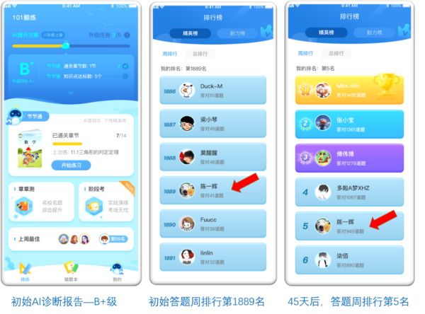 王子峰玩游戏很厉害,一做题就叫苦连天。在101鲸练AI题库,系统推送的题都不太难,但是又有一定的挑战性,每周王子峰都会晒自己的答题周排行,和几个朋友一起PK。做题就像玩游戏,很有意思,王子峰越战越勇,45天就从1889名冲刺到第5名,他爱上智能练题,重拾学习兴趣。