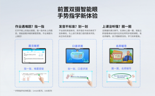 优学派学生平板Umix9和U60系列产品,通过1300W+500W前置双摄智能眼,实现3D定位识别,让AI指学更精准,学习更高效。孩子有什么问题,指着书本直接问,指单词、指句子、指图片、指题目,指到哪里学哪里。同时,AI指学功能还支持多种手势动作的精准识别,满足孩子不同的学习需求。孩子遇到不会做的题目,打开平板上的指尖搜题,对着书本上的题目指一指,就能查看详细解题思路;学习英语时,打开优学派书本点学,用手指在单词或句子下划条横线,马上就能进行口语跟读评测,听力考试专家领读让孩子发音更标准;上课没听懂的章节,指着课文画个圈,就能听名师视频同步教学,生动又有趣。
