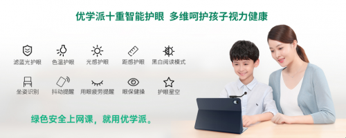 优学派的绿色家管系统的四大特色功能配合十重护眼功能,共同组成了孩子绿色安全上网课的屏障,守护孩子线上学习身心健康。
