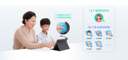其中,家管系统的重要特色之一便是优学派独有的家长指纹管理。此功能将指纹识别系统和家管系统相结合,指纹的唯一性使得家长管理更安全,一个管理员密码+多个家长指纹管理,不怕密码记不住,不怕密码被泄露。父母不在家,家里老人也能用指纹完成家长管理功能,家长出门在外也安心。