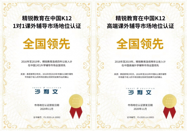 在教学成果方面,精锐高端辅导始终领先市场,全球领先的独立第三方机构Frost & Sullivan数据显示,中国高端的K12课后辅导的行业增速快于整体的K12行业增速, 是一个黄金赛道,而精锐高端辅导是毋庸置疑的领先企业:2016年至2019年,精锐高端辅导连续4年在中国1对1升学辅导市场全国领先;2018-2019年,连续两年在中国高端升学辅导市场全国领先。创立13年来,累计赢得超百万用户及高端家庭选择,深受学生和家长的好评,牢牢占领行业领先地位。