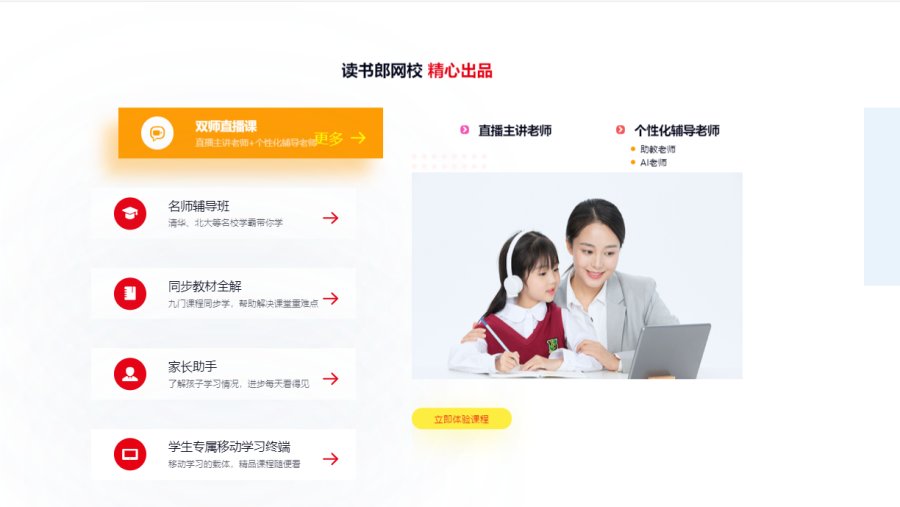 读书郎网校将专业教育智能硬件与多样教学软件有机融合,创造独特的在线教育品牌。读书郎网校下设有同步教材全解、双师直播课、名师辅导班和AI智能学习系统等学习辅导产品,给孩子提供优质教学资源。同时还配备专属的学习终端——读书郎教育直播平板,能全方位辅助孩子学习。